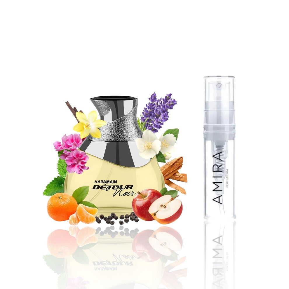 Nada más oler el eau de parfum Al Haramain Détour noir te dará la bienvenida el aroma fresco y jugoso de la mandarina y la manzana verde, que se complementa con la elegante fragancia cítrica de la bergamota y la pimienta rosa, ligeramente picante. El frescor cristalino de la lavanda impregna toda la composición.