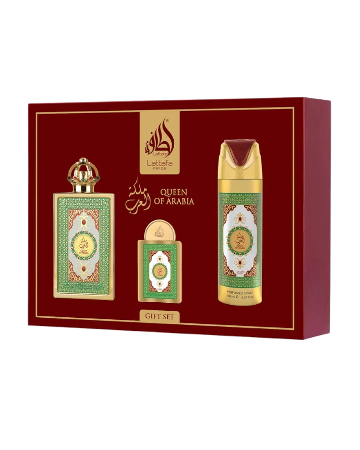 Queen of Arabia de Lattafa es una fragancia que rinde homenaje a la feminidad, la elegancia y el poder de la mujer árabe. Este Gift Set exclusivo envuelve los sentidos con un aroma sofisticado, dulce y sensual, diseñado para mujeres que desean destacar con presencia y distinción.
