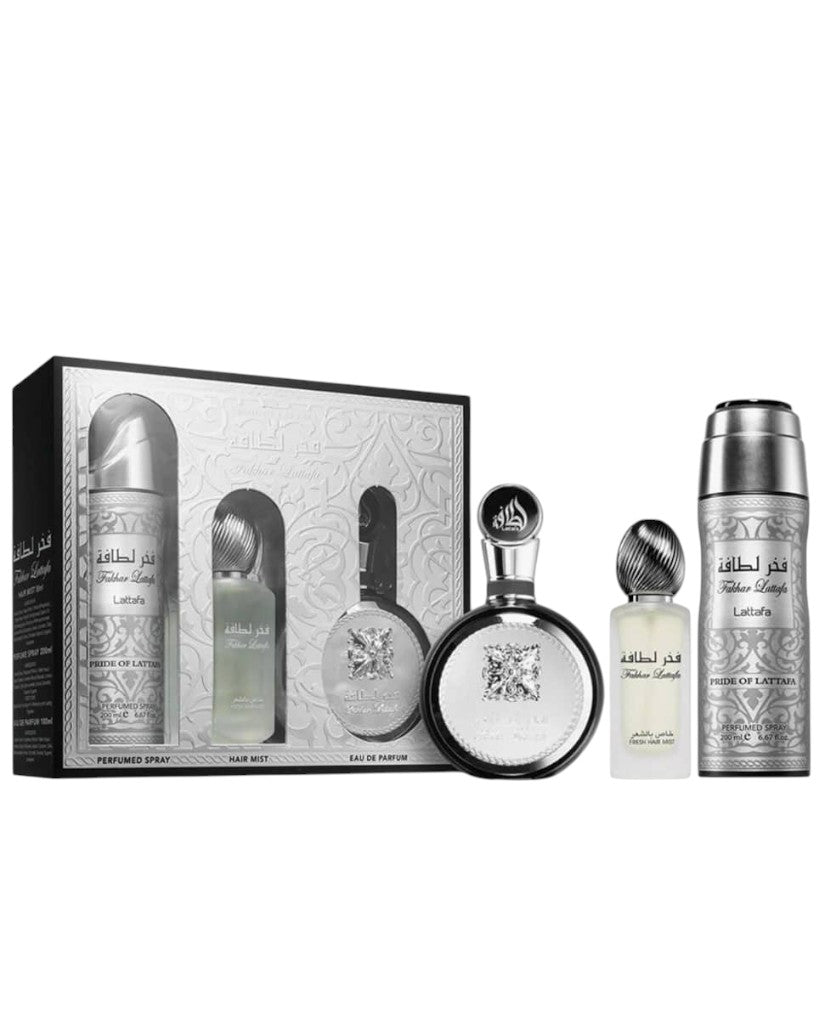 El Estuche Lattafa Fakhar es la opción ideal para quienes buscan regalar o disfrutar de una experiencia aromática completa. Cada estuche incluye fragancias y productos cuidadosamente seleccionados, ofreciendo un aroma oriental, cálido y sofisticado, característico de la línea Fakhar de Lattafa.